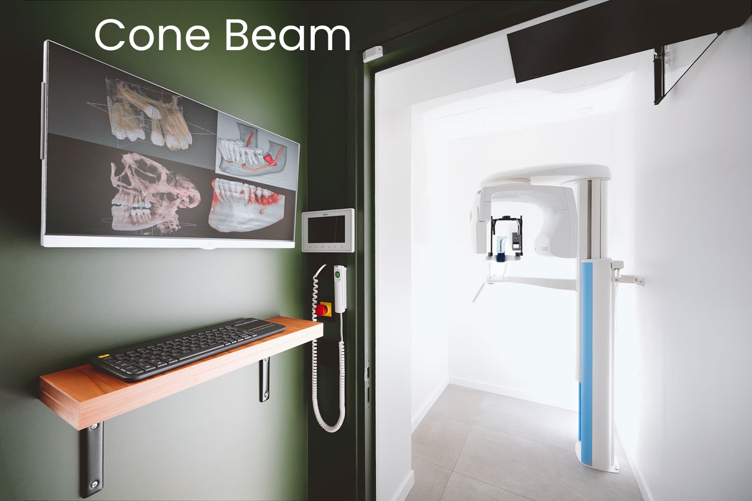 Seul un examen radiographique tridimensionnel, comme un Cône Beam CT, permet de savoir précisément le volume osseux disponible pour la position et mise en place des implants dentaires. Notre cabinet dentaire est équipé d'une tomographie volumique à faisceaux coniques aussi appelée Cône Beam ou Cône Beam Computed Tomography (CBCT).